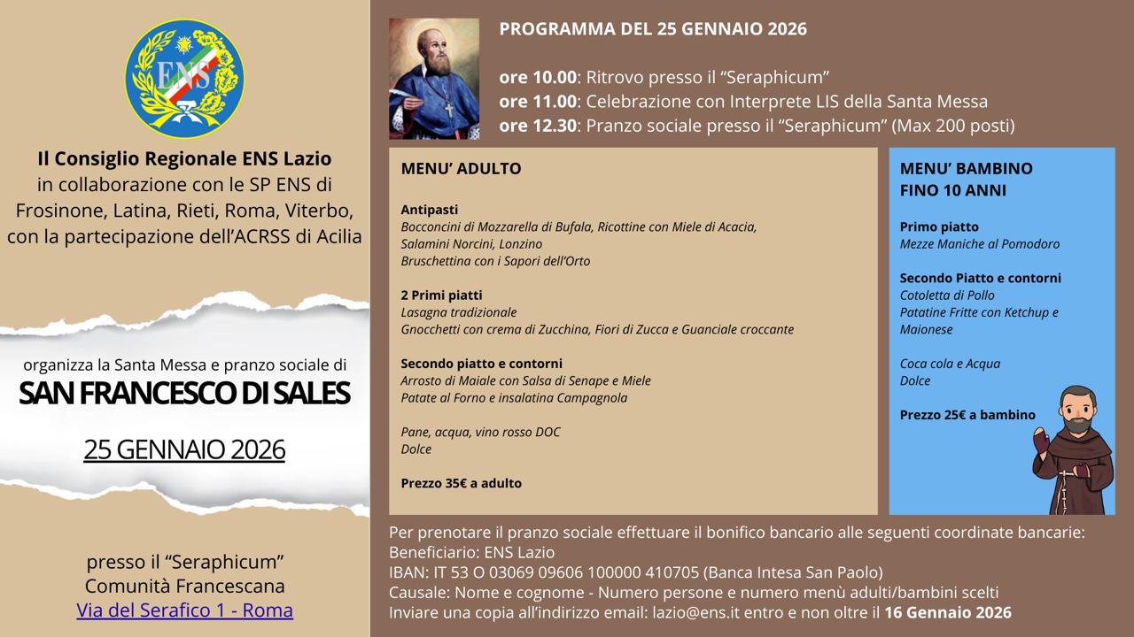 Il Consiglio Regionale ENS Lazio, in collaborazione con le Sezioni Provinciali ENS di Frosinone, Latina, Rieti, Roma e Viterbo, e con la partecipazione dell’ACRSS di Acilia, organizza la Santa Messa e il pranzo sociale in onore di San Francesco di Sales, Patrono dei Sordi, in programma domenica 25 gennaio 2026 presso il Seraphicum – Comunità Francescana, in Via del Serafico 1, Roma.